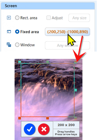 The area can be defined by clicking the settings button on the right. Use the mouse and keyboard to adjust the area. You can also press Enter or Space to finish.