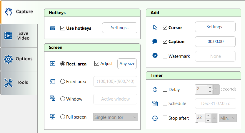 The Capture tab is for what you want to record a video.