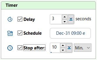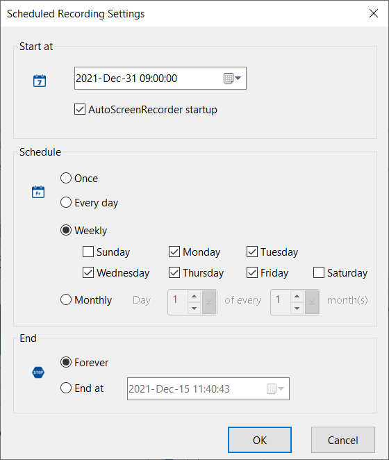 Record according to a schedule. It will be enabled when Fixed area, Active window or Specific window is selected in Window, or Full screen is selected in the Screen group.