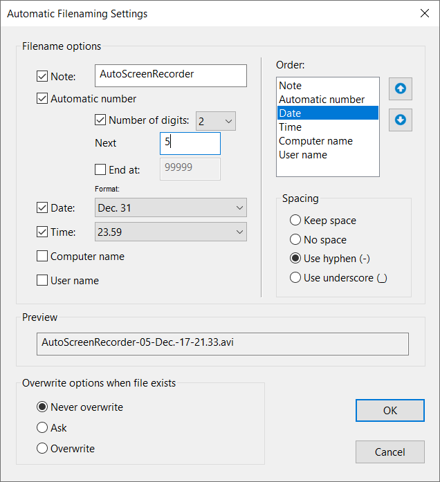 Ask me - Select if you want to be asked each time. A dialog box will be displayed after each recording. You can change the filename and location.