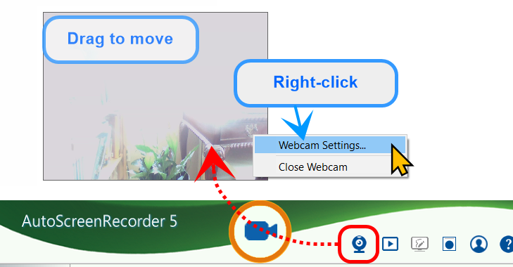 Show the webcam so you can record it in a video. Click the webcam icon to toggle between show and hide.